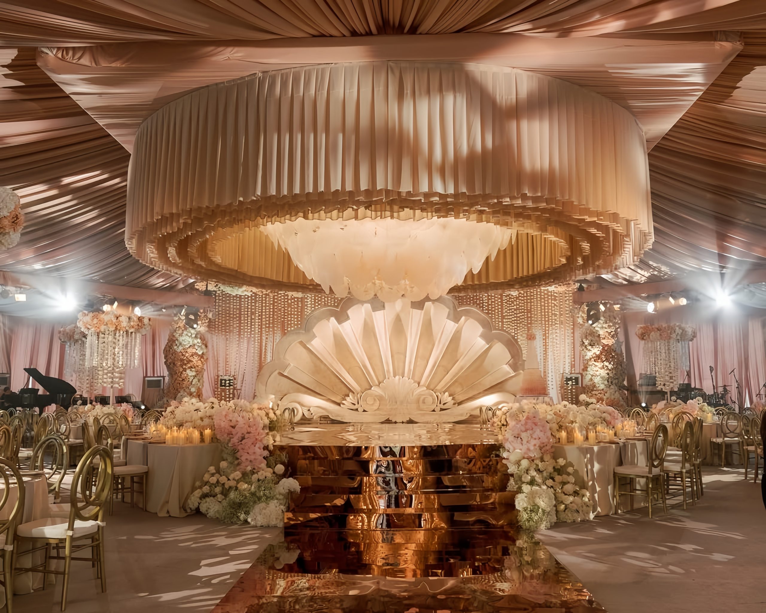 Royal Design Indonesia menghadirkan dekorasi pernikahan dengan nuansa megah dan detail yang mewah. Vendor ini terkenal dengan backdrop tinggi, ornamen gold, chandelier besar, dan penggunaan bunga premium, sering menjadi pilihan untuk wedding berskala besar di ballroom hotel bintang lima.
